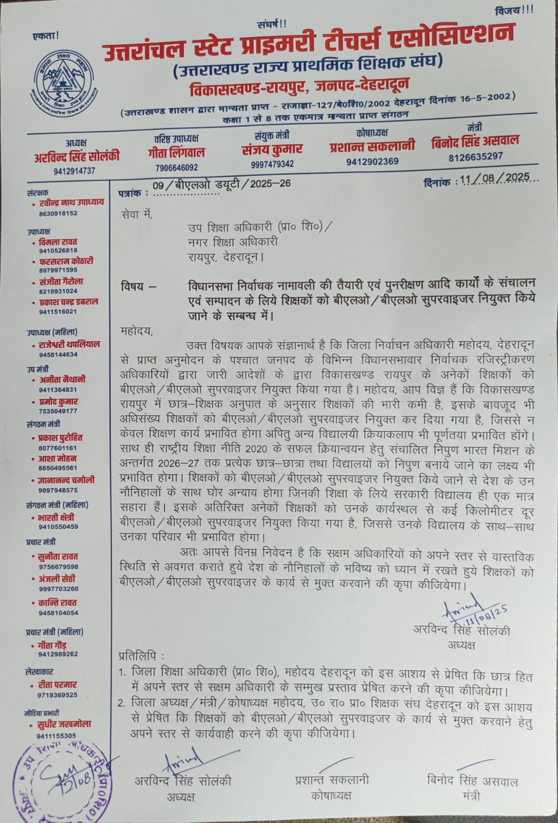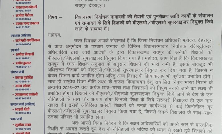 विधानसभा निर्वाचक नामावली की तैयारी एवं पुनरीक्षण आदि कार्यों के संचालन एवं संपादन के लिये शिक्षकों को बीएलओ के रूप में नियुक्त किये जाने पर उत्तराखण्ड राज्य प्राथमिक शिक्षक संघ रायपुर इकाई ने गहरा रोष प्रकट करते हुये शिक्षकों को बीएलओ ड्यूटी से मुक्त रखने सम्बन्धी ज्ञापन उप शिक्षा अधिकारी को सौंपा। उत्तराखण्ड राज्य प्राथमिक शिक्षक संघ रायपुर के अध्यक्ष अरविन्द सिंह सोलंकी ने बताया कि सैकड़ों शिक्षक अभी पंचायत चुनाव तथा मतगणना संपन्न करा कर विद्यालय में पहुंचे ही थे कि अब उन्हें अग्रिम आदेशों तक विधानसभा निर्वाचक नामावली तैयार करने के लिये बीएलओ के रूप में नियुक्त कर दिया गया है, जिससे विद्यालयों की व्यवस्थायें बुरी तरह प्रभावित हो रही है। उन्होंने कहा कि शिक्षकों के ऊपर शिक्षण कार्य के साथ ही अनेकों विभागीय ऑनलाइन तथा ऑफलाइन कार्यों के साथ-साथ पी एम पोषण योजना के सफल संचालन की जिम्मेदारी भी है, उसके बावजूद अग्रिम आदशों तक शिक्षकों को बीएलओ के रूप में नियुक्त कर दिया गया है जिससे समाज के एक बड़े वर्ग के नौनिहालों के शिक्षण का एक मात्र सहारा सरकारी विद्यालयों की व्यवस्थायें बुरी तरह प्रभावित हो रही हैं। अनेकों शिक्षकों को उनके कार्यस्थल से कई किलोमीटर दूर के मतदेय स्थलों पर बीएलओ नियुक्त किया गया है जिससे उनके विद्यालय के साथ-साथ उनकी पारिवारिक दायित्व भी प्रभावित हो रहे हैं। उन्होंने बताया कि पूर्व में आंगनबाड़ी कार्यकत्रियां तथा आशा वर्कर बीएलओ के कार्य को बखूबी संपादित कर रहीं थी, लेकिन अचानक से उन्हें हटाकर शिक्षकों को बीएलओ नियुक्त कर दिया गया है। उन्होंने सभी शिक्षकों को बीएलओ के कार्य से तत्काल मुक्त करने के लिये उप शिक्षा अधिकारी को अपने स्तर से आवश्यक कार्रवाही करने का अनुरोध किया है।