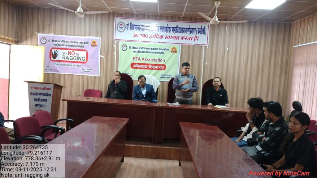 कर्णप्रयाग(अंकित तिवारी): कर्णप्रयाग कॉलेज में कॉलेज के प्राचार्य प्रो. राम अवतार सिंह की अध्यक्षता में एंटी रैगिंग बैठक का आयोजन किया गया। इस बैठक में यूजीसी के द्वारा रैगिंग की रोकथाम हेतु लागू किए गए नए प्रावधानों पर चर्चा की गई और शिक्षक, छात्र-छात्राओं तथा प्रशासन के दायित्वों को स्पष्ट किया गया।