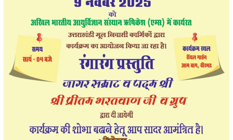 कार्यक्रम की शुरुआत सायं 4 बजे से होगी और यह रॉयल गार्डन, आम बाग, वीरभद्र, ऋषिकेश में आयोजित होगा।