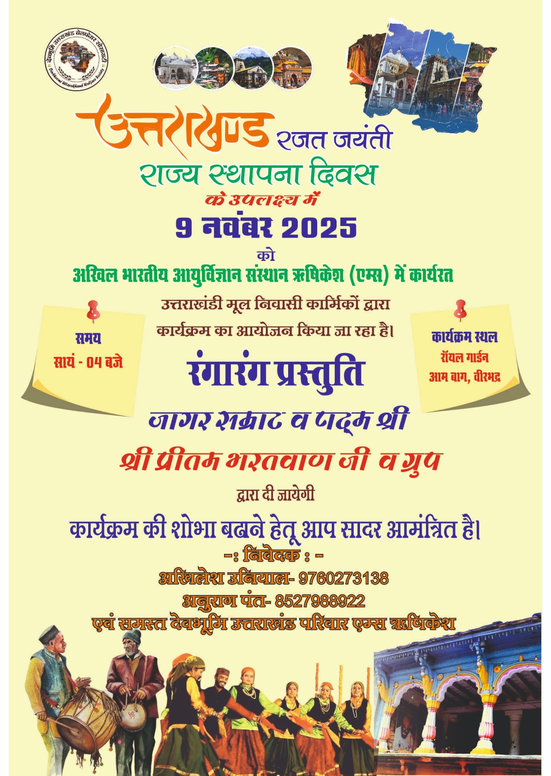 ऋषिकेश(अंकित तिवारी): उत्तराखंड राज्य के स्थापना दिवस की रजत जयंती के अवसर पर एक भव्य कार्यक्रम का आयोजन किया जा रहा है, जो 9 नवंबर राज्य स्थापना दिवस के अवसर में ऋषिकेश में संपन्न होगा। इस कार्यक्रम का आयोजन एम्स ऋषिकेश में कार्यरत उत्तराखंडी मूल निवासी कार्मिकों द्वारा उत्तराखंड की सांस्कृतिक धरोहर को बढ़ावा देने और राज्य की पहचान को विश्व स्तर पर प्रस्तुत करने का एक महत्वपूर्ण कदम है। इस कार्यक्रम का आयोजन देवभूमि उत्तराखंड वेलफेयर सोसाइटी, उत्तराखंड परिवार-एम्स ऋषिकेश, द्वारा किया जा रहा है।