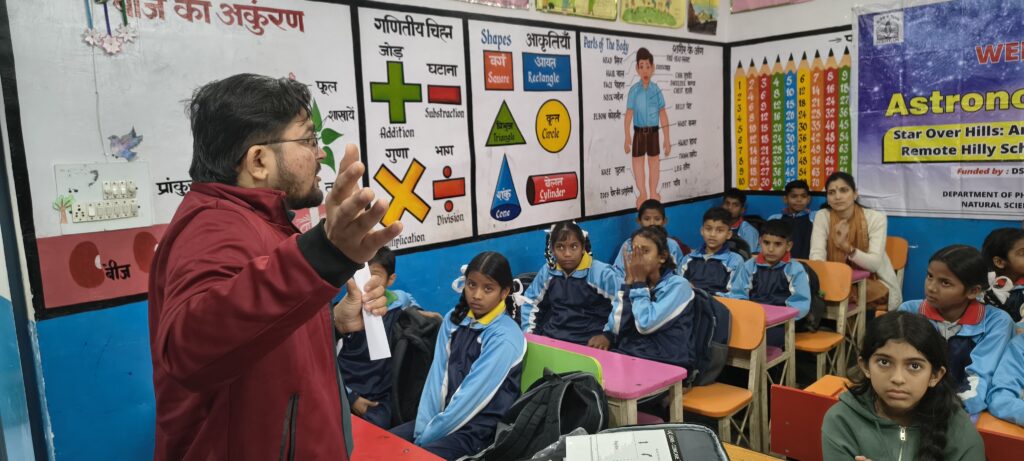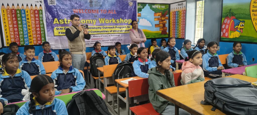 कार्यक्रम का अंतिम सत्र खगोल विज्ञान पर आधारित रहा। जिसे डॉ. आशीष रतूड़ी, विभागाध्यक्ष, भौतिकी विभाग, डॉल्फिन (पीजी) इंस्टीट्यूट ऑफ बायोमेडिकल एंड नेचुरल साइंसेज (DIBNS) एवं उनकी Astronomy Club टीम द्वारा संचालित किया गया। इस सत्र में विद्यार्थियों को दूरबीन के उपयोग तथा रात्रि आकाश की पहचान के बारे में जानकारी दी गई, जिससे उनमें अंतरिक्ष के प्रति विशेष उत्साह देखने को मिला। इस कार्यशाला में कक्षा 5 के सभी 23 विद्यार्थियों ने उत्साहपूर्वक सहभागिता की।